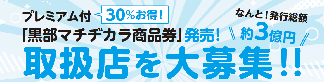 黒部商工会議所では、黒部市内の取扱登録店で利用できる期間限定の30%のプレミアム付き商品券を発行いたします。この商品券の発行は地域経済の活性化を目的として、黒部市内での消費拡大と購買の促進を図るものです。