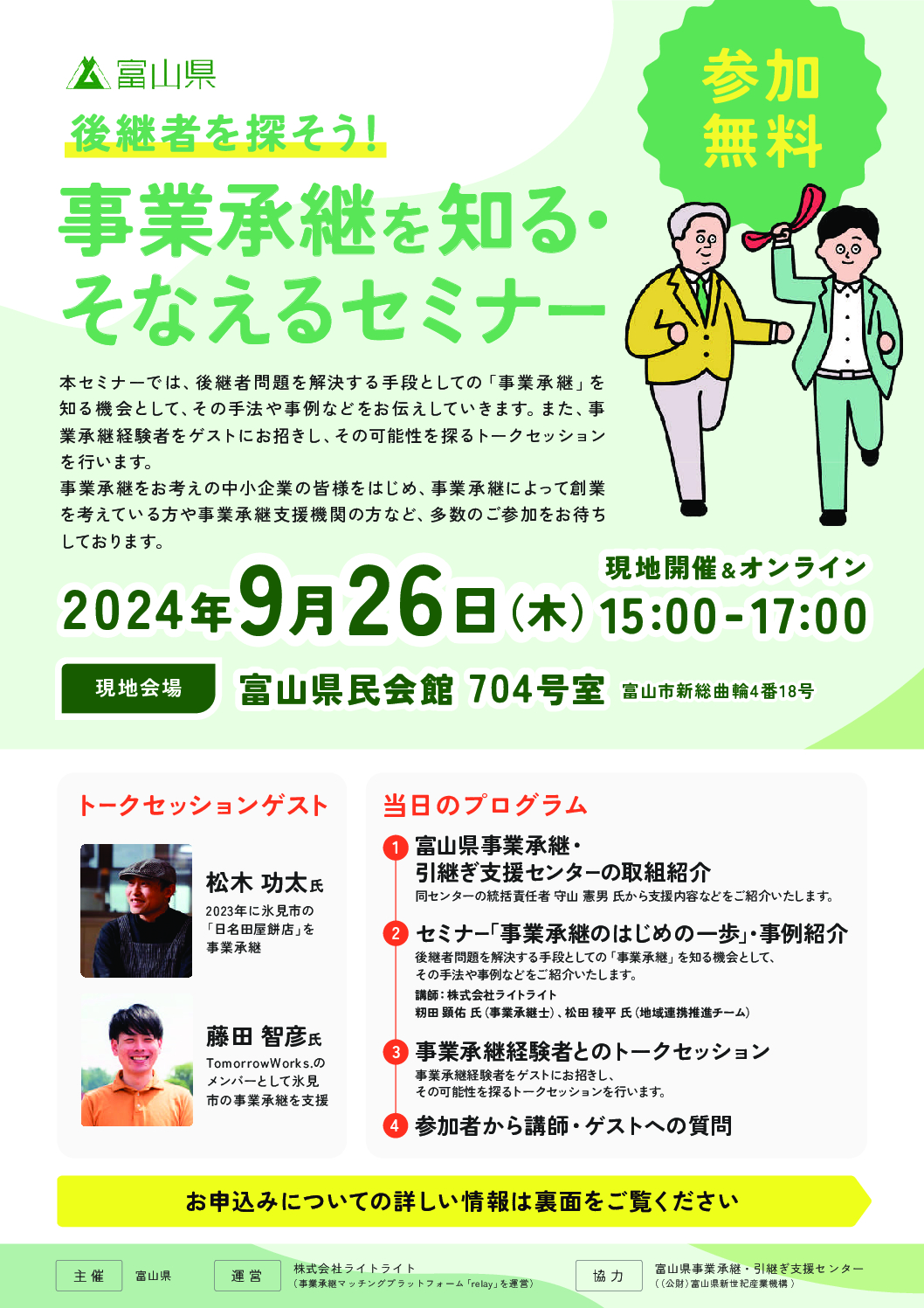 また、事業承継経験者をゲストにお招きし、その可能性を探るトークセッションを行います。