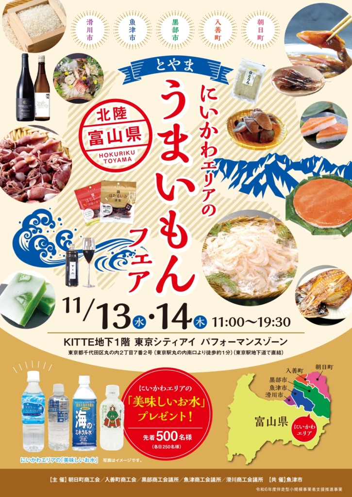 『水』を軸に、川上から川下まで豊かな自然環境を育み、林産物、農作物、海産物のみならず、伏流水を使った加工品まで揃う国内随一の『食の王国、富山』において、本イベントは、北アルプスの膝下で県内でも特に自然に恵まれた「にいかわ(朝日町~滑川市)」エリア3市2町の厳選商品をご用意しました。